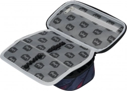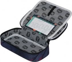 Tento penál má pevnou konstrukci a odklápěcí přepážku, která usnadňuje organizaci a přístup ke školním potřebám.