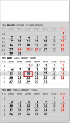 Praktický plánovací kalendář s tříměsíčním rozložením a orientační lištou s posuvným jezdcem. Obsahuje kalendárium s českými jmény a světovými svátky na šedém pozadí.