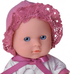 Modré oči, růžová čepička a bílo‑růžový obleček s králíčkem. Pohyblivé končetiny a odolné materiály pro dlouhé hraní.