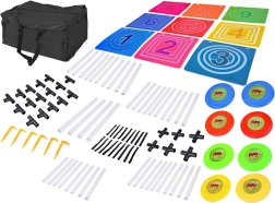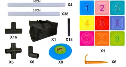 - Terč s poli, 8 disků, taška, trubky 40 cm × 4, trubky 35 cm × 38, spojky × 28, suché pásky × 18, plastové kolíky × 6