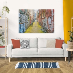 Ulička s graffiti a koly vytváří pestrý a dynamický obraz, který zaujme na první pohled a po složení skvěle ozdobí interiér.