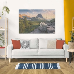 Detailní ilustrace s alpskými kozami na skalách a panoramatem hor nabízí atraktivní vizuální výzvu a nádherný výsledek.