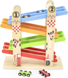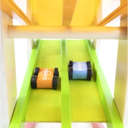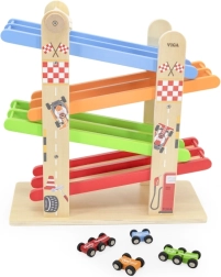 Tato robustní dřevěná dráha nabízí dvojitou rampu pro napínavé závody dvou autíček současně. Děti zaujme pestré barevné provedení a zvonky umístěné v cíli, které se rozezní při dojezdu vozítek. Konstrukce je přizpůsobena malým dětským rukám – hladké hrany, stabilní základna a odolné materiály zaručují dlouhou životnost i bezpečnou hru.