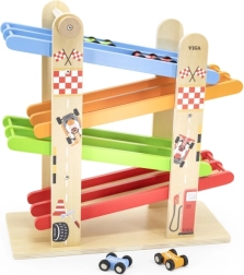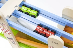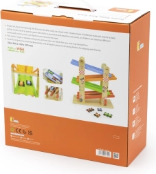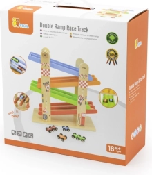 Zábavná dřevěná závodní dráha s dvojitým pruhem od Viga přináší dětem nekonečné závody a radost z pohybu. Dva paralelní pruhy umožní pořádat souboje dvou autíček najednou, na konci je přivítají zvonky v cíli. Odolné provedení z lakovaného dřeva, bez ostrých hran a s netoxickými barvami je bezpečné pro malé ruce. Součástí je 4 barevná autíčka ve dvou provedeních (4kolová a 6kolová), která podporují motoriku, koordinaci oko–ruka a hravou formou seznamují s fyzikálními principy.