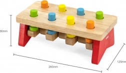 - Obsah balení: lavice, barevné kolíky, dřevěné kladívko