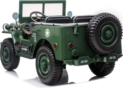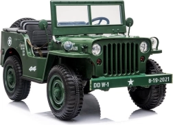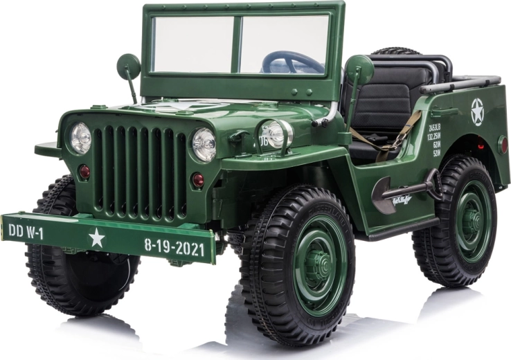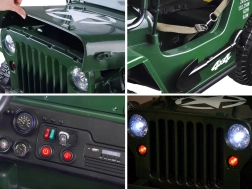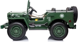 Vojenské terénní auto pro 3 osoby je pro všechny děti, které mají rády vojenskou tematiku. Vojenský džíp, silné, výkonné, velké masivní vozidlo, které jistě zvládne vojenské úkoly. Jak se na takové vozidlo sluší, je vojenský terénní vůz vybaven veškerým potřebným příslušenstvím a výzbrojí. Vůz s pohonem všech čtyř kol má možnost dvojího pohonu, takže je na řidiči, aby se rozhodl, kdy příslušný pohon použije. Vůz je vybaven úložnými prostory, kufrem a lopatou. Má zvukové efekty, světelné efekty, sklopné čelní sklo, široká sedadla. Vozidlo má možnost ovládání dálkovým ovladačem nebo samostatně řidičem.