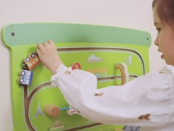 Interaktivní vláček na zeď promění každý pokoj v hravé vzdělávací centrum. Tři samostatné panely se snadno montují na stěnu a šetří místo, zatímco pestré barvy a hmatové prvky lákají k objevování. Děti si procvičí úchop, koordinaci oko–ruka i vnímání příčin a následků, a to vše bezpečně díky preciznímu dřevěnému zpracování a netoxickým barvám.
