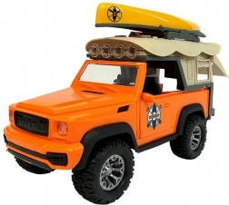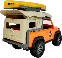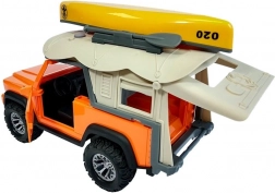Dobrodružná sada pro malé cestovatele: robustní terénní auto JEEP s světelnými a zvukovými efekty, otevíracími dveřmi a zadní klapkou, gumovými pneumatikami a střechou pro převoz kajaku s pádly. Ideální hračka pro děti od 3 let, která rozvíjí fantazii a lásku k přírodě.