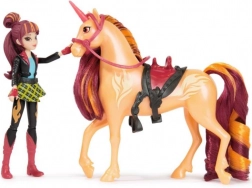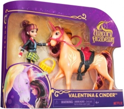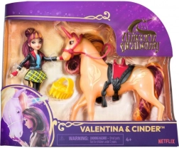 Sada Akademie jednorožců: Valentina a Cinder nabízí úžasné zážitky pro děti. Valentina, vysoká 11 cm, je velmi detailně zpracovaná a má 7 pohyblivých kloubů, což jí umožňuje různé dynamické pózy. Cinder o výšce 13 cm doplňuje Valentinu svými ohnivými magickými detaily a červeno-oranžovou hřívou a ocasem, které lze česat s přiloženým hřebínkem.