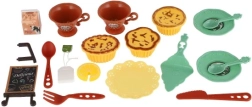 Sada zahrnuje šálky, talířky, příbory, drobný dezert a tabulku s nápisem – vše připravené pro stylové servírování a společenskou hru.