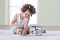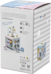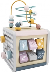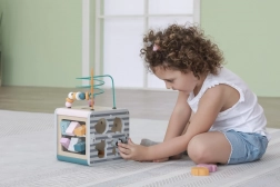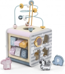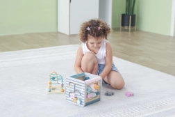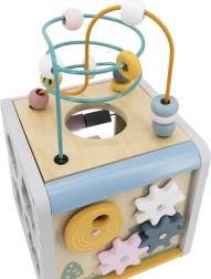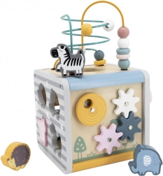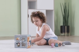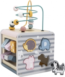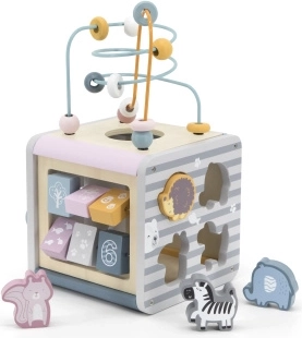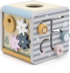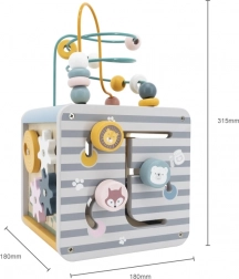 Na horní straně najdete drátěný labyrint s korálky pro rozvoj jemné motoriky a trpělivosti. Boční stěny ukrývají vkládačku se zvířátky, otáčecí kostky s čísly pro první počítání, ozubená kolečka pro pochopení příčiny a následku a posuvné prvky na trénink koordinace.