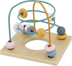 Labyrint s korálky, zvířátkový posuvný labyrint, ozubená kolečka, vkládačka tvarů se zvířátky a otočné číslicové kostky – vše pro komplexní rozvoj.