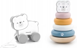 Hraní s pyramidou rozvíjí logiku, trpělivost a rozpoznávání barev, zatímco tahací medvídek přirozeně podporuje chůzi a koordinační dovednosti. Obě hračky jsou vyrobeny z kvalitního dřeva s hladkými hranami pro bezpečné používání.