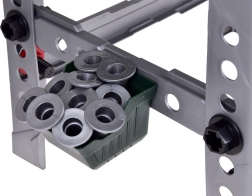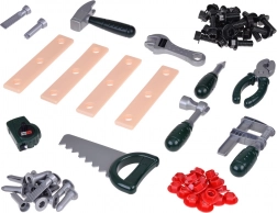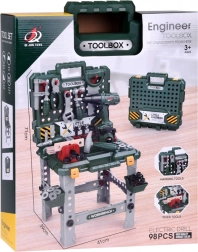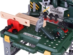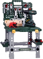 - Bohatá výbava: pracovní stůl, šrouby a matice, aku vrtačka, kladivo, ruční pila, ráčna, francouzský klíč, kombinačky, šroubovák, metr, posuvné měřítko, desky s otvory, svěrák a přihrádky.