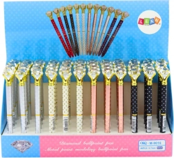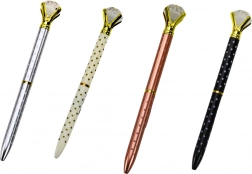 Elegantní kuličkové pero s velkým třpytivým „diamantem“ na horní části dodá vašemu psaní styl a šmrnc. Jemný modrý inkoust a hrot 0,7 mm zajišťují hladké a plynulé psaní. Dostupné v mixu barev – bílé, černé, stříbrné a pudrově růžové.
