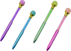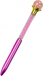 Stylové kuličkové pero s ozdobnou diamantovou koulí a průhledným tělem plným třpytivých kamínků. Píše modrým inkoustem (hrot 0,7 mm) a skvěle se hodí na každý den i jako elegantní doplněk. K dispozici je mix barev těla – růžová, modrá, zelená a fialová.
