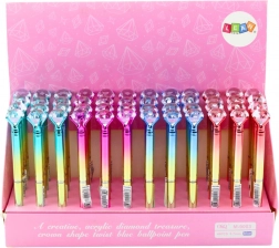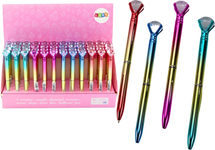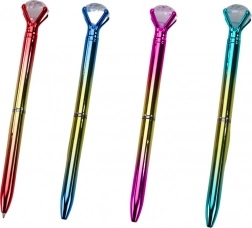 Elegantní kuličkové pero s velkým třpytivým „diamantem“ na konci dodá vašim poznámkám i korespondenci luxusní vzhled. Plynulé psaní modrým inkoustem, univerzální hrot 0,7 mm a zlaté tělo s barevnými akcenty (růžová, modrá, červená, zelená) z něj dělají stylový doplněk pro každý den i výjimečné příležitosti.