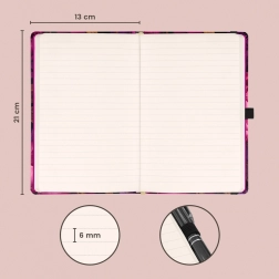 Stylový linkovaný zápisník ve vzhledu fialových květů o rozměrech 13 x 21 cm. Perfektní pro každodenní poznámky a nápady.