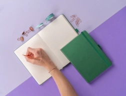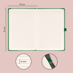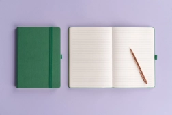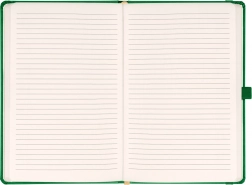 Elegantní linkovaný notýsek Aprint v zeleném provedení nabízí klasický design, praktičnost pro každodenní psaní a povrch s jemnou strukturou, na který lze snadno razit firemní loga.