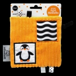Oboustranný design přináší dvě atraktivní ilustrace – tučňáka a mývala – a množství detailů pro zkoumání: stužky, plyšová poutka a větší štítek pro snadnější uchopení. Tyto prvky podporují koordinaci oko–ruka a cvičení jemné motoriky.