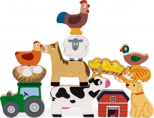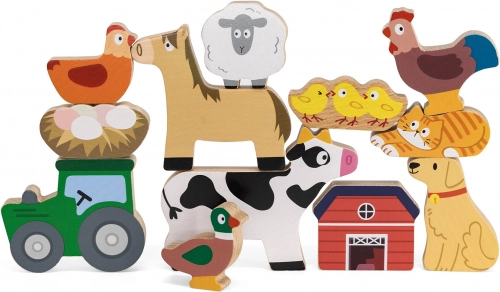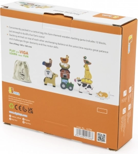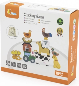 Tato dřevěná sada obsahuje 12 dílků s motivem farmy. Skládání zvířat na sebe a zároveň udržení rovnováhy vyžaduje velkou trpělivost, zručnost prstů a jemnou motoriku. Dílky jsou zabaleny v látkovém sáčku. Rozměry balení cca 16x15x4 cm. Rozměry sáčku 18x18,5 cm. Věk 18m+
