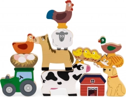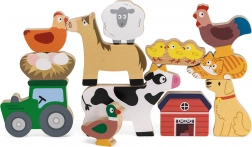 Kůň, kráva, kachna, pes, kočka, slepice, ovečka, traktor, stodola a další – ideální pro skládání, třídění i volnou hru.