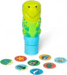 Sada obsahuje vše potřebné pro okamžité zahájení podmořské výpravy. Razítko s usmívající se želvou a třistovkami nálepek živě ztvárňují mořské rostliny, korály a podvodní krajiny. Dále obsahuje 24stránkovou knížku s barevnými podklady zobrazujícími oceány, korálové útesy, pláže a další vodní scenérie pro vytváření příběhů.