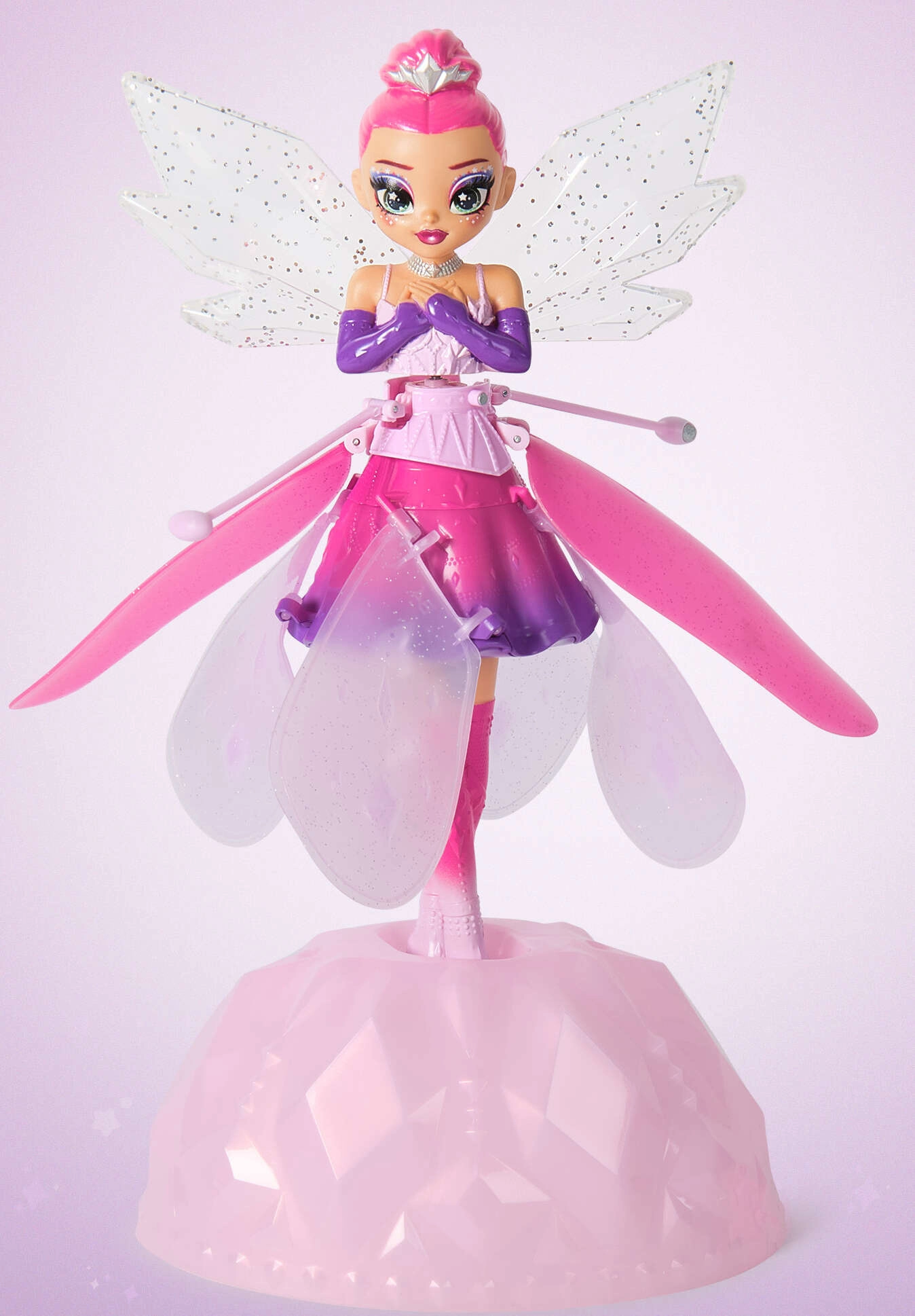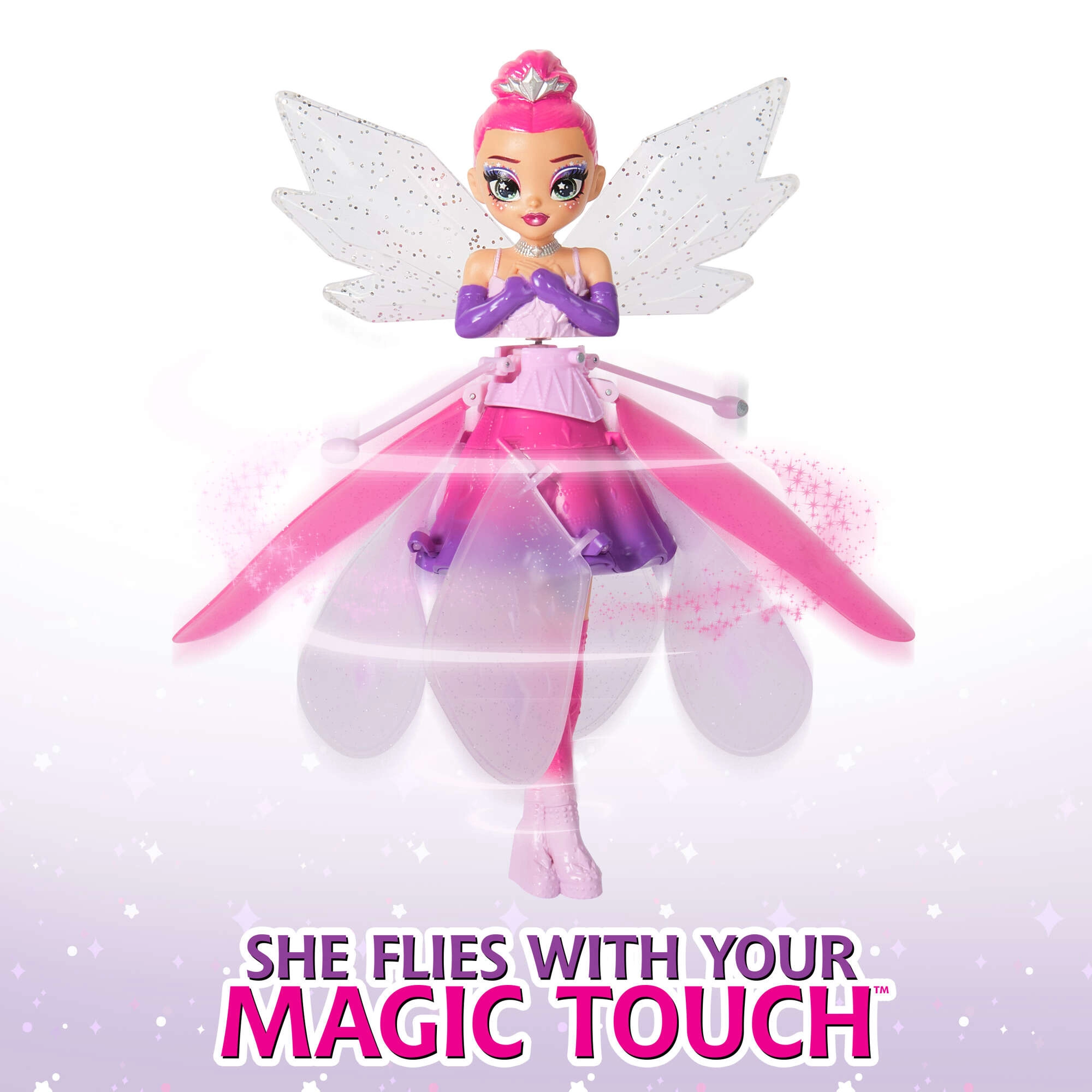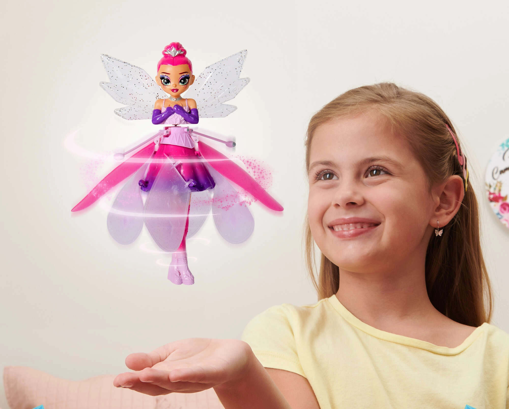 Létající panenka HATCHIMALS Crystal Flyers promění každý pokoj v kouzelnou scénu. Po zapnutí se víla roztočí a elegantně vzlétne. Pomocí vestavěných pohybových senzorů reaguje na vaše ruce, takže ji můžete snadno navádět ve vzduchu a nechat ji tančit nad dlaněmi. Je vyrobena z odolných a bezpečných materiálů, které zvládnou každodenní hraní.
