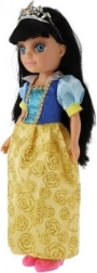 Panenka má dlouhé černé vlasy, modré oči a nosí krásné šaty v modro-žluté kombinaci s růžovými botami.