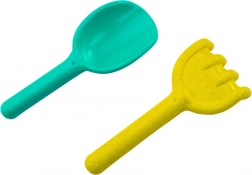 Tato komplexní sada na písek je ideální pro malé stavitele. Středobodem je pískový mlýnek se dvěma koly – nahoře se nachází sitko pro prosévání písku a z druhé strany trychtýř pro hravé experimenty s vodou a pískem. Součástí jsou také praktické nástroje: lopatka pro nabírání a přenášení a hrábě pro tvarování a uhlazování.