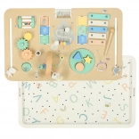 Dřevěný dětský stolek 3+ spojuje principy montessori a zábavu: xylofon s paličkou, vkládačka tvarů, ozubená kolečka a posuvné prvky i korálkový labyrint rozvíjejí jemnou motoriku a logické myšlení; bezpečné oblé hrany, netoxické barvy a mátový design, deska vhodná i na psaní a kreslení.