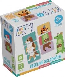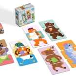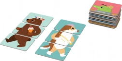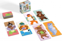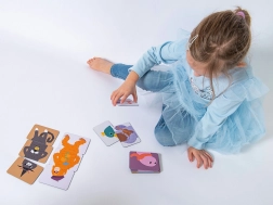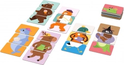 18 oboustranných karet zobrazujících 12 zvířátek nabízí spoustu variant skládání, která zabaví děti na dlouhou dobu.