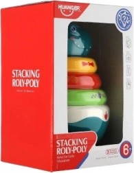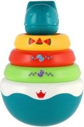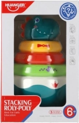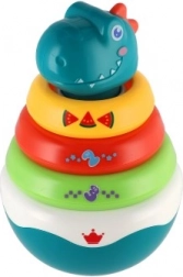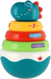 Tato hravá skládací pyramida s motivem dinosaura spojuje zábavu a učení. Zaoblený podstavec se při ťuknutí kolébá do všech směrů a aktivuje příjemný zvuk rolničky, který přirozeně stimuluje sluch. Děti si procvičí úchop, třídění kroužků dle velikosti a poznávání barev – ideální pro první objevování světa.