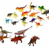 Různobarevné plastové figurky dinosaurů, doplněné příslušenstvím, podporují fantazii a vzdělávání formou hry.