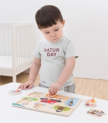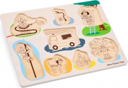 Vkládačka obsahuje osm dílků, z nichž každý má svůj vlastní otvor a úchytku pro snadné uchopení. Pod každým dílkem je obrázek, který pomáhá dětem najít správné místo.