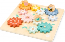 Pro hru nechte děti umístit ozubená kolečka na dřevěnou desku, aby do sebe zapadla a vše se točilo jako na kolotoči. Rozměry balení jsou 27,5 x 27,5 x 7,5 cm.