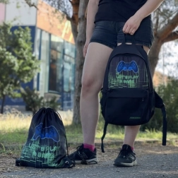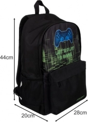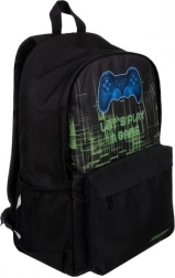 Interiér nabízí prostornou hlavní komoru s polstrovanou kapsou na notebook, přední kapsu se skrytým zipem na drobnosti a dvě boční síťované kapsy na láhev či deštník. Moderní herní grafika s ovladačem dodává batohu originální vzhled, který potěší všechny fanoušky gamingu.
