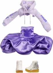 Tato panenka vyniká fialovým outfitem s lesklou sukní a stylovými legíny. Její dlouhé fialové vlasy a trendy vzhled jsou ideální pro módní hraní a stylování.