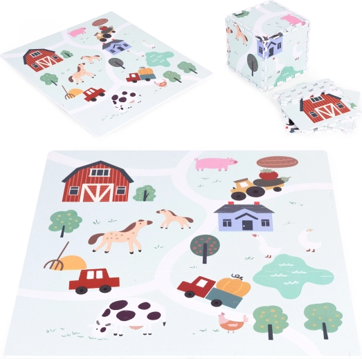 Dětská pěnová podložka s motivem farmy propojuje bezpečí a zábavu v jednom. Nabízí 21 dílů puzzle, rozměr 90,5 × 90,5 cm a tloušťku 1 cm pro pohodlné hraní i první krůčky. Vyrobená z certifikované EVA pěny, je protiskluzová, snadno omyvatelná a chrání před chladem podlahy – ideální pro kreativní hru a učení dětí od 3 let.