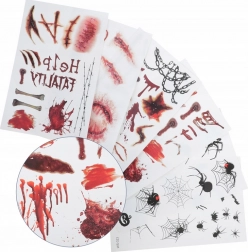 Každý arch nabízí různé vzory – od krvavých šplíchanců po pavouky a jizvy. Vzory jsou dodávány v mixu, výběr není možný.