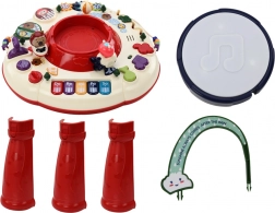 Pět kláves učí tóny stupnice a středový bubínek reaguje světlem i zvukem. Krátké melodie a efekty rozvíjejí smysly a rytmus.