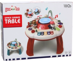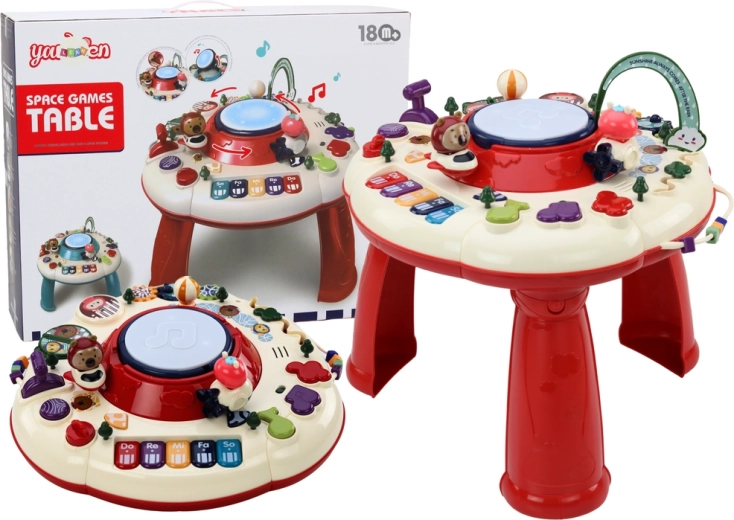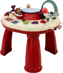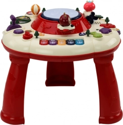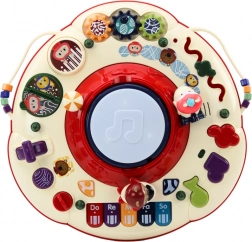 Interaktivní vzdělávací stolek pro batolata přináší zábavu i učení v jednom. Nabízí světelné a zvukové efekty, pianínko s tóny stupnice, bubínek reagující na dotyk, ozubená kolečka, posuvné prvky a tlačítka se zvířátky. Stabilní konstrukce na třech nožkách lze použít i bez nožek na podlaze. Skvěle rozvíjí jemnou motoriku, sluch, zrak i logické myšlení.