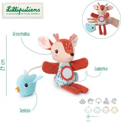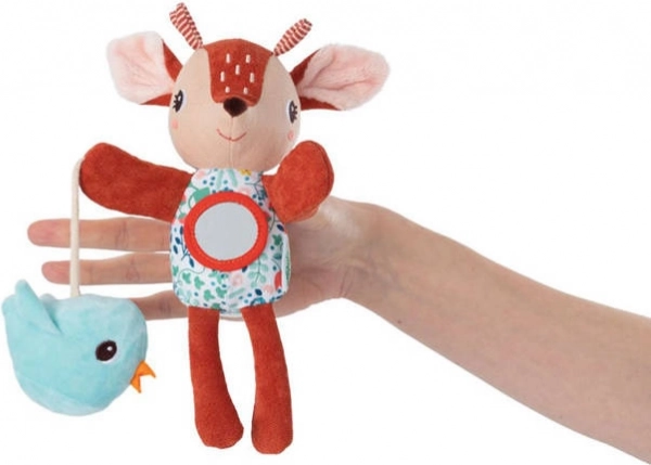 Roztomilý maňásek srnka z kolekce Stella od značky Lilliputiens je měkoučká hračka pro první příběhy, mazlení i zklidnění. Díky otvorům v tlapkách se snadno ovládá, má zvoneček v hlavičce, měkké zrcátko na bříšku a šuštícího ptáčka na šňůrce. Podporuje jemnou motoriku, koordinaci ruka-oko a rozvíjí smysly. Vhodné od 6 měsíců.
