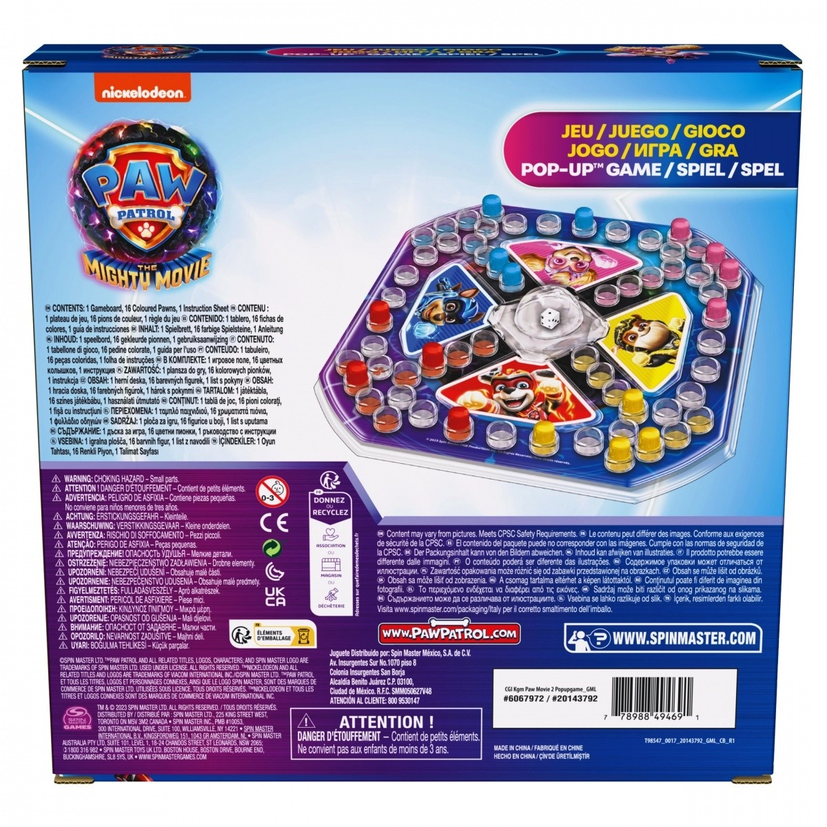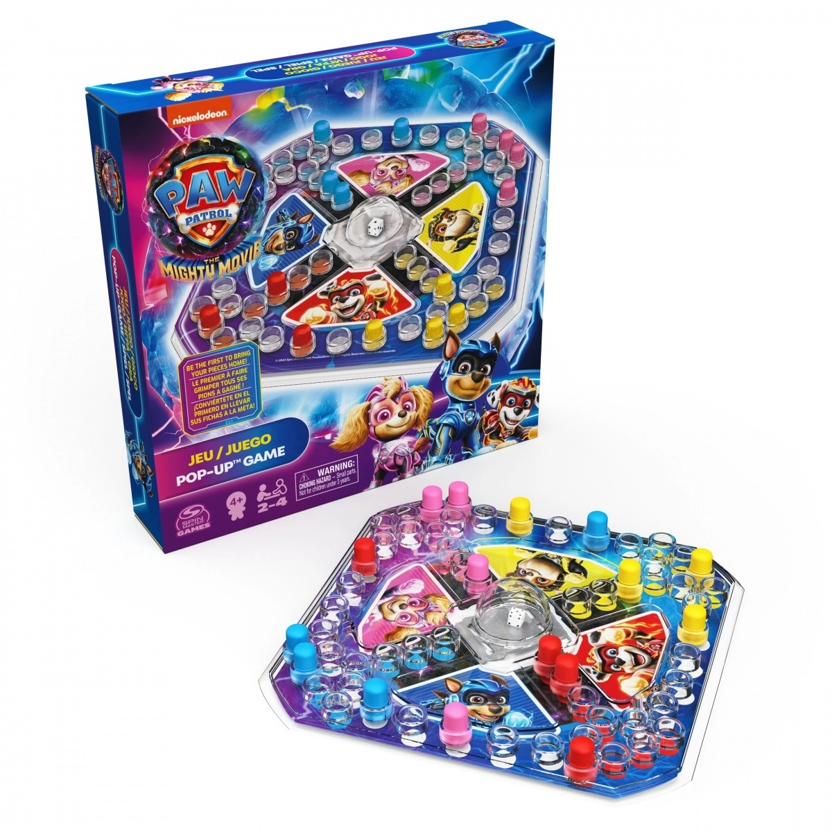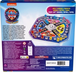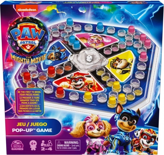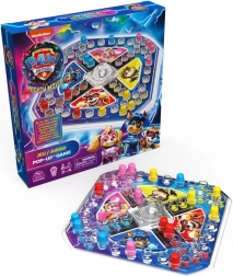 Vydejte se na závodní dobrodružství s hrdiny PAW PATROL! Barevná plastová herní pláně je rozdělena do čtyř zón v barvách oblíbených pejsků (Chase – modrá, Marshall – červená, Rubble – žlutá, Skye – růžová). Ve středu je kostka pod průhlednou kopulí Pop Up – stačí stisknout a kostka sama „vyskočí“. Žádné kutálení po stole, jen čistá zábava.