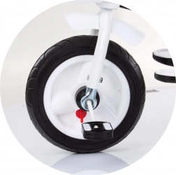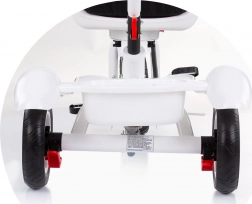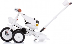 Praktická výbava zahrnuje otočné sedadlo ve 2 směrech, 2 polohy sklonu, skládací podnožku, skládací stříšku se sluneční clonou a přední i zadní koš na drobnosti. Velká gumová kola s blatníky poskytují stabilitu a tichou jízdu, zatímco řídítka s hudbou a světlem potěší malé jezdce.