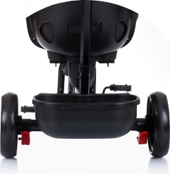 Měkké polstrování, 3bodové pásy s ramenními vycpávkami a kryt předního kola chrání dětské nožky. Nožní brzda na zadních kolech pro jisté zastavení.
