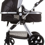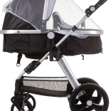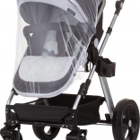 Velká nastavitelná stříška se sluneční clonou, 5bodové pásy s polstrováním, prostorný koš, odnímatelné madlo, nánožník, taška, držák nápojů a moskytiéra – vše v ceně.
