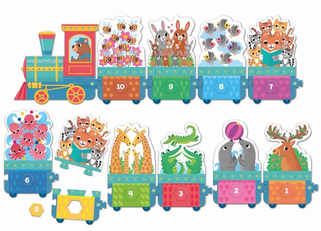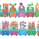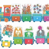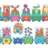 Každý vagónek je očíslovaný a plný zvířátek, takže děti přirozeně procvičují počítání a pořadí čísel při zábavném skládání.