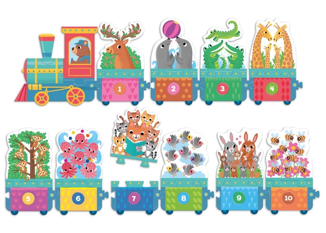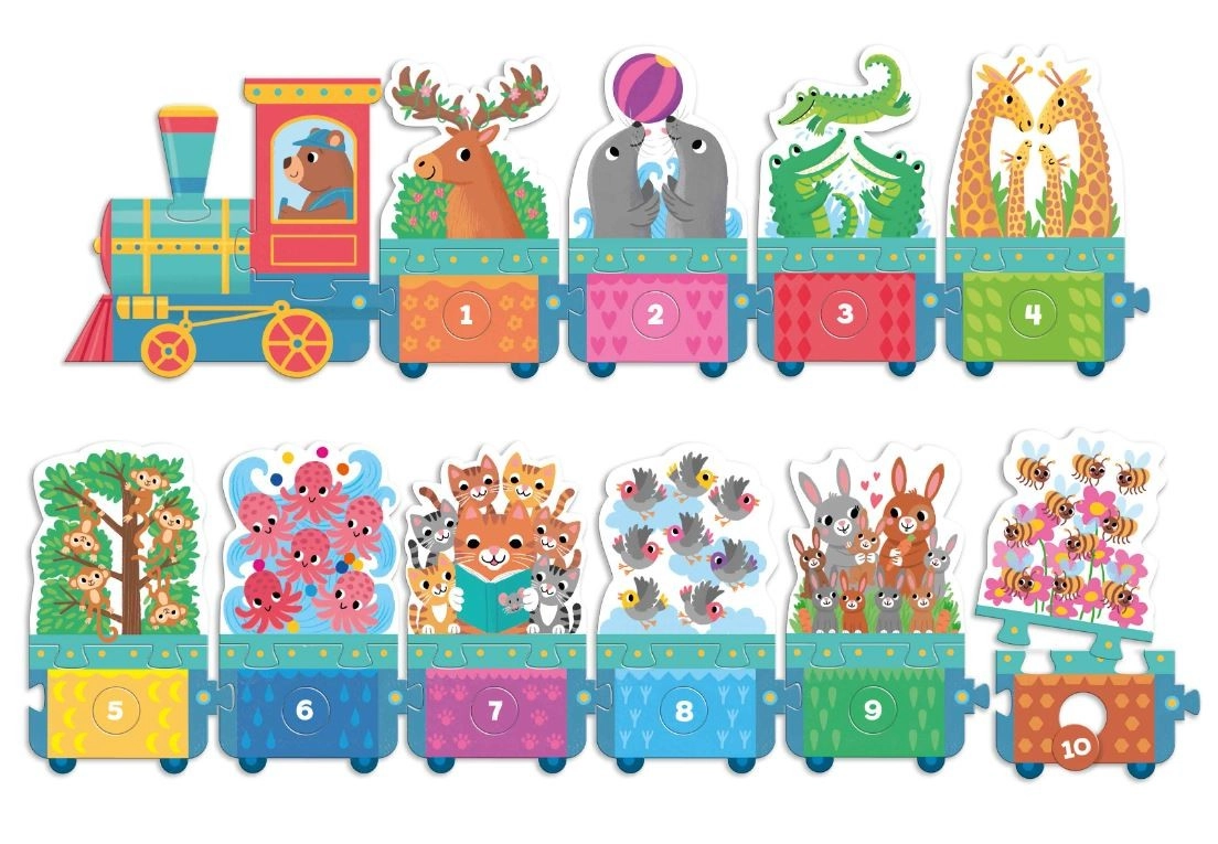 Vydejte se na barevnou jízdu s maxi puzzle vláčkem, kde každý vagónek ukrývá roztomilá zvířátka a čísla od 1 do 10. Děti skládají lokomotivu s vagónky do správného pořadí, přiřazují čísla a procvičují počítání i pozorovací schopnosti. Velké a pevné dílky jsou navrženy pro bezpečné a pohodlné hraní.