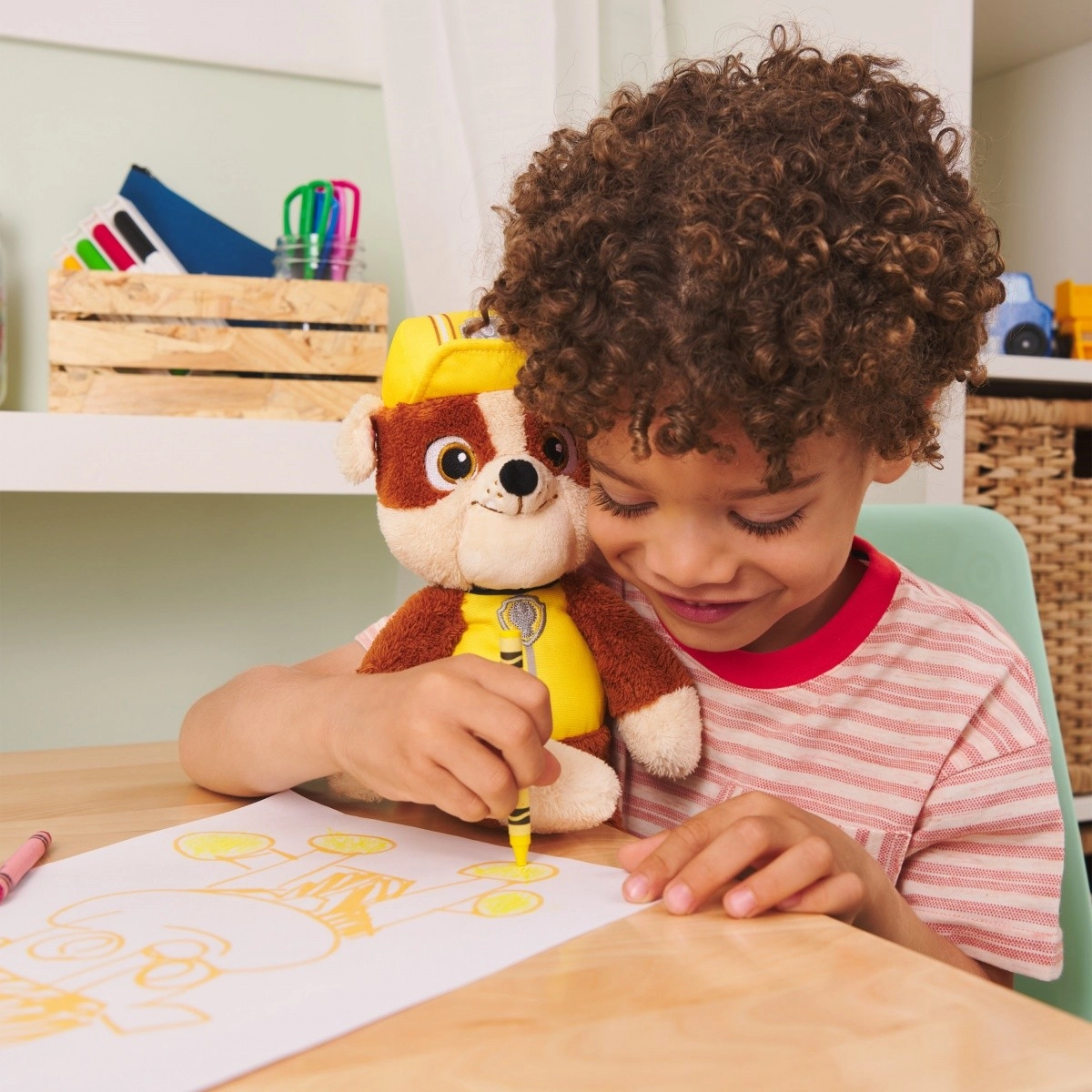 Tento 33 cm velký Rubble je v žluté stavební uniformě a helmě, s charakteristickým odznakem Tlapkové Patroly a hnědým plyšem, ideální pro hraní na cestách.